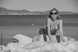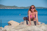 beautiful woman in pink bikini sits seductively on rocks on the coast of adratic sea