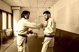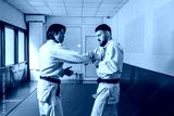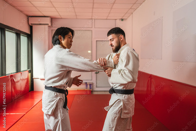 Two martial arts athletes practicing arm lock in gym
