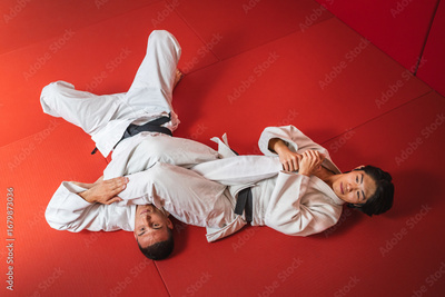 Two martial artists performing a leg lock on a red mat