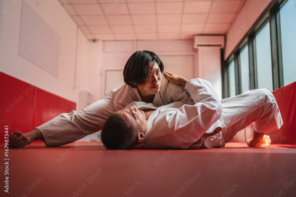 Determined female judo athlete executing a ground hold on male opponent during training