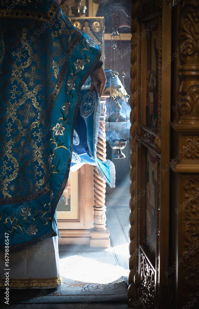 Priest in beautiful blue vestment at Divine Liturgy on Feast of the Virgin in Orthodox church, censer and incense smoke in sunlight at altar