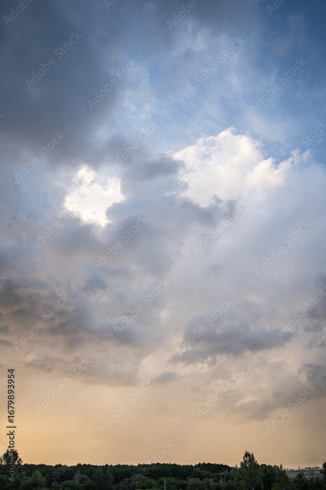 Dramatic thunderous sunset sky with dark huge rain clouds over green forest