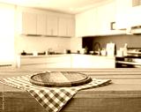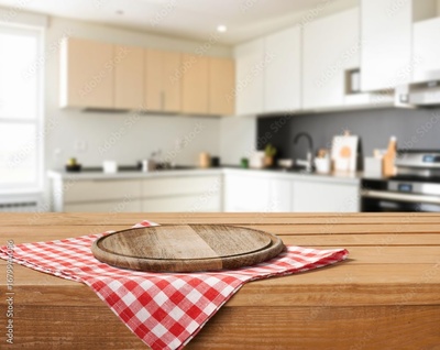 Wood desk top on kitchen background.