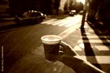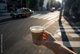 Hand holding coffee cup at crosswalk with passing taxi