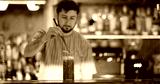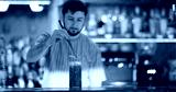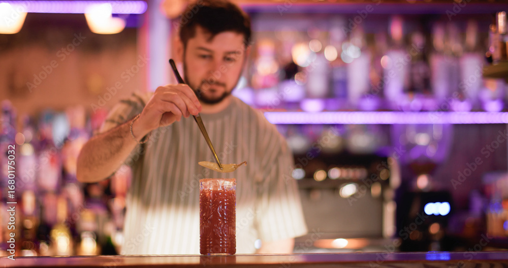Preparing alcoholic drink. Spicy cocktail. Male barman adding green hot pepper pod to red liquid in glass. Garnishing bloody mary.