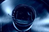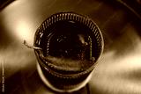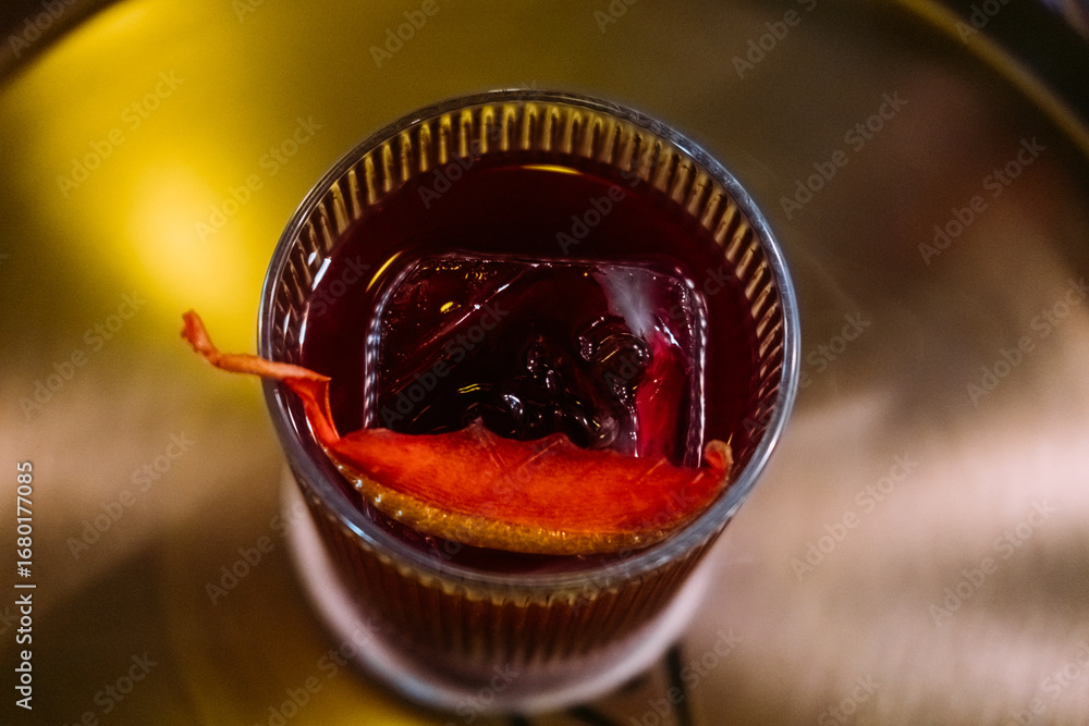 Negroni glass. Alcoholic drink. Red cocktail served with ice cube citrus slice peel. Aromatic refreshing liquor mix on pub counter.