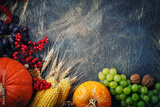 The table, decorated with vegetables and fruits. Harvest Festival,Happy Thanksgiving.