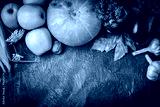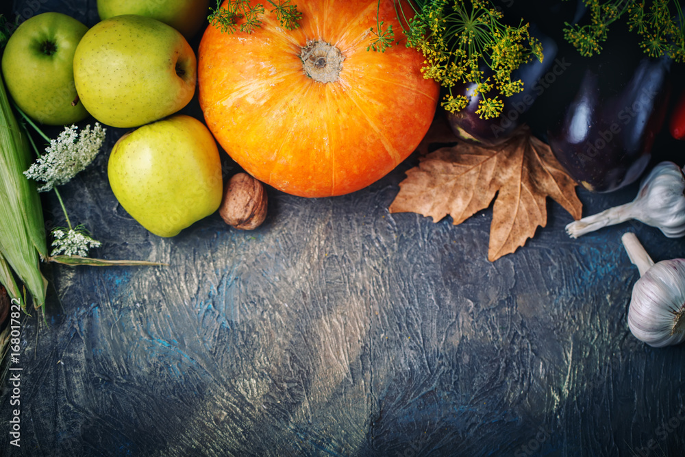 The table, decorated with vegetables and fruits. Harvest Festival,Happy Thanksgiving.