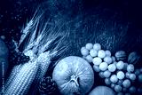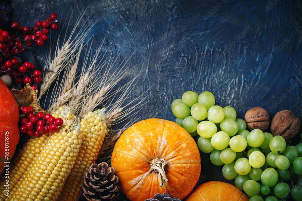 The table, decorated with vegetables and fruits. Harvest Festival,Happy Thanksgiving.