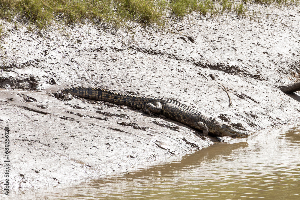 A Saltwater crocodile on the bank of a river getting ready to re-enter the water. Western Australia.