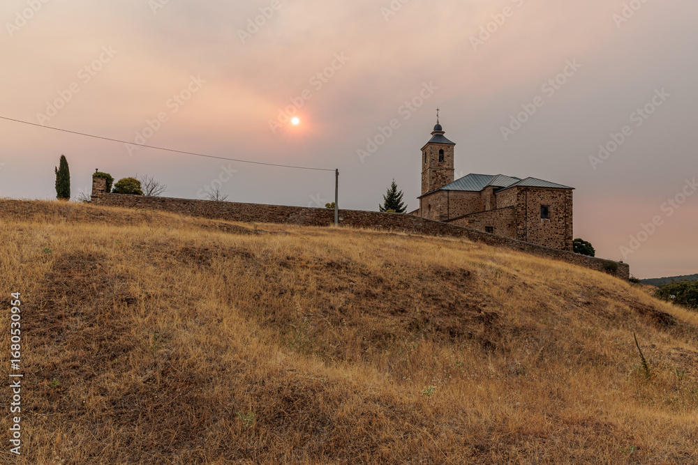 General view of the Sanctuary of Our Lady of Castrotierra with the sky covered in smoke from a forest fire. Castrotierra de la Valduerna, León, Spain.