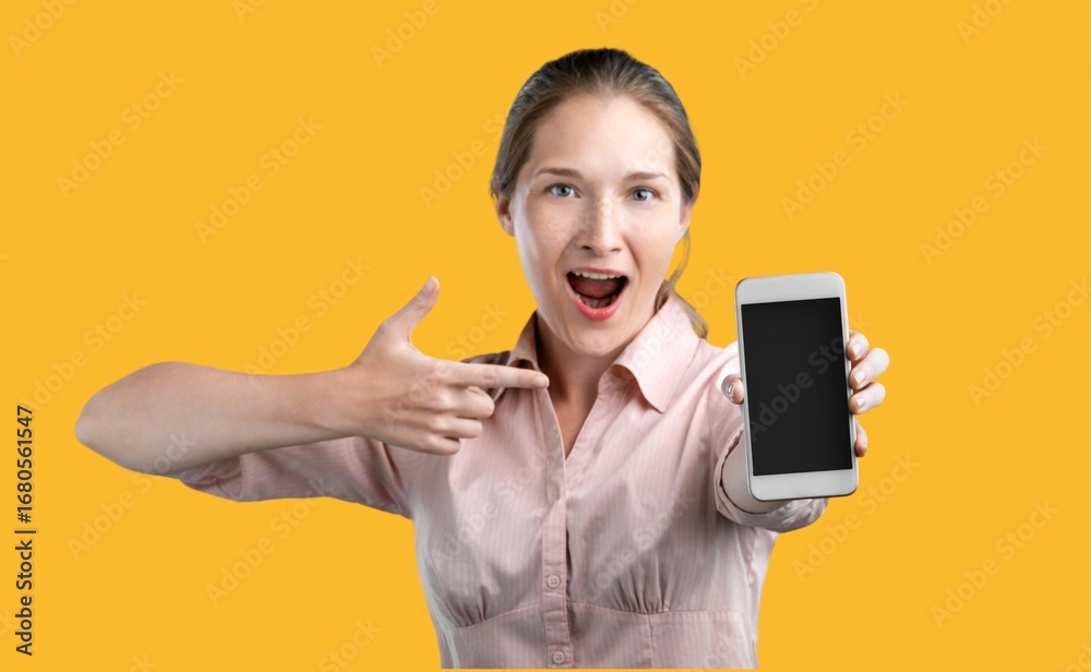 Great News concept. Portrait Of Surprised Woman Holding Smartphone