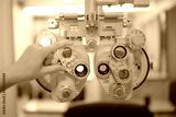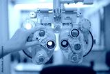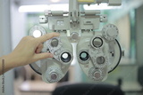 close up of an industrial machine, The doctor's hands are operating medical instruments. The doctor's hand is using a machine to measure the patient's eyesight.