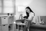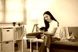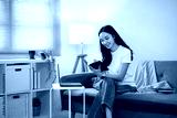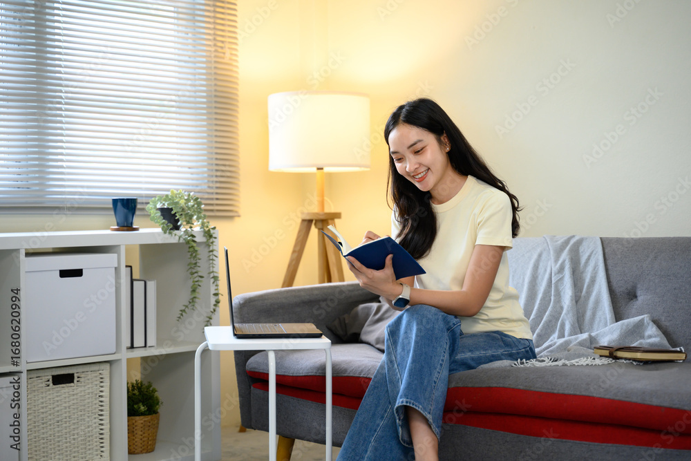Focused young woman writing notes in a blue notebook while sitting on a sofa at home