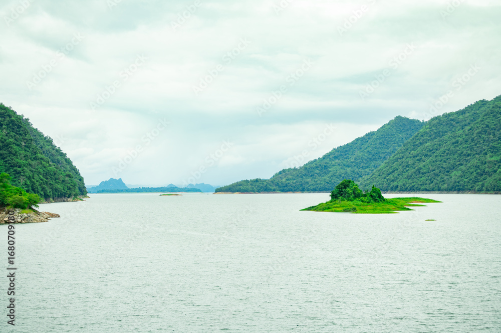 A wide landscape view of a hydroelectric dam reservoir surrounded by lush green mountains and dense forest, symbolizing clean energy, renewable power, and sustainable natural resource management.