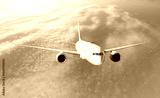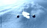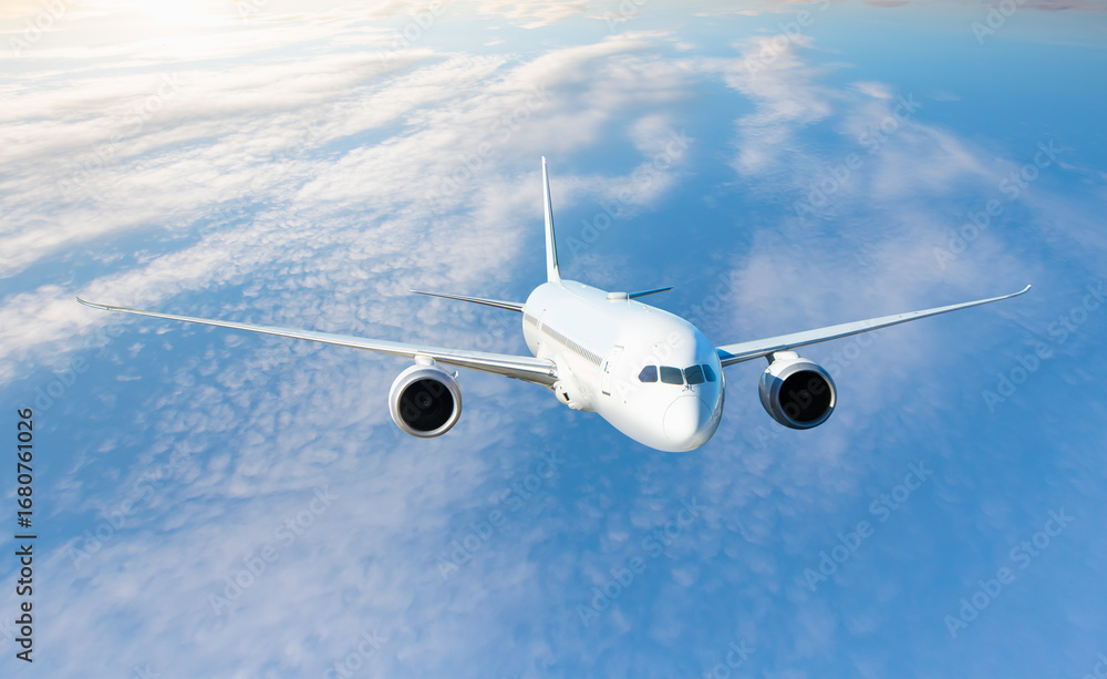 White passenger airplane flying in the sky amazing clouds in the background - Travel by air transport