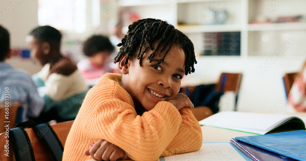 Boy, happy and portrait in classroom with arms crossed, pride and confidence for learning at academy. Kid, smile learner and pupil for education, lesson or development with books at elementary school