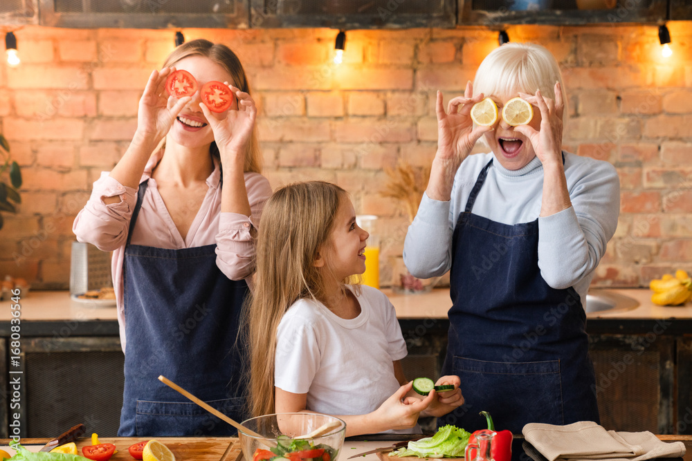 Beautiful woman enjoying with her mother while cooking together and little girl watching on them. Happy daughter, mom, grandmother playing, have fun with vegetables in kitchen