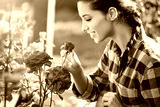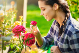 Young smiling gardener in the garden. Taking care of roses in the garden.