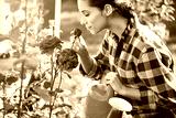 Young smiling gardener in the garden. Taking care of roses in the garden.