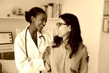 Female doctor gently touches shoulders, supporting elderly 60s patient