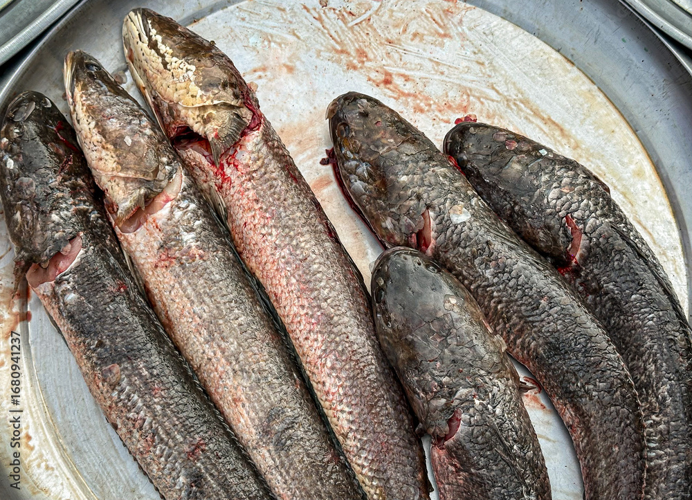 Fresh Snakehead fish(Channa striata.,Channa striata) sales at the local market, Imge from mobile phone