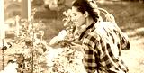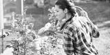 Young smiling gardener in the garden. Taking care of roses in the garden.