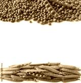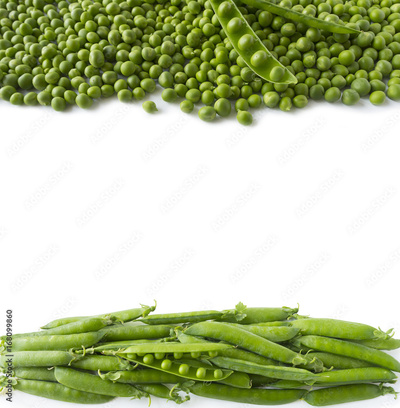 Green peas at border of image with copy space for text. Green peas on a white background.