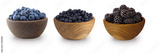 Black-blue berries isolated on white background. Collage of berries. Blueberry, bilberry, blackberry. Collection of fruits and berries in a bowl.