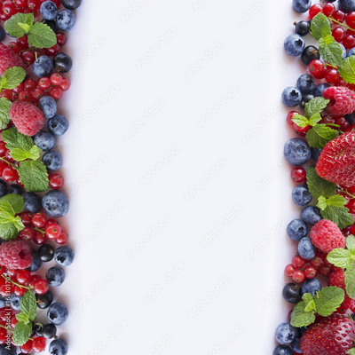 Various fresh summer berries on white background. Ripe raspberries, blueberries, blackcurrants and red currants, mint. Background berries. Top view.
