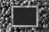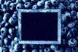 Empty blackboard on blueberry background. Texture blueberry berries close up