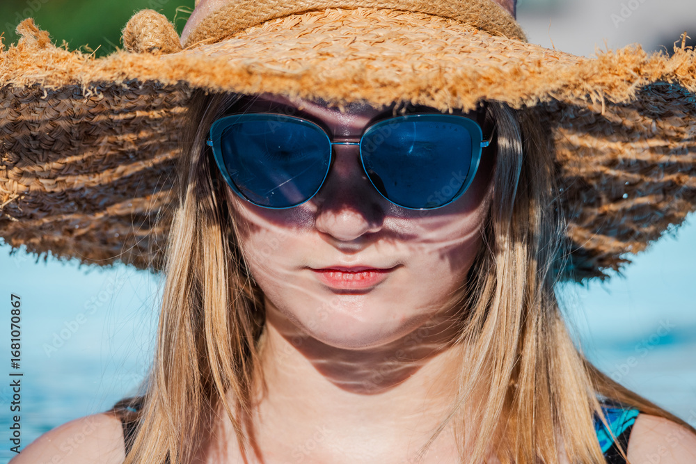 Close-up portrait of a young woman wearing a straw hat and blue sunglasses by the pool, enjoying a sunny summer day outdoors.