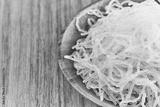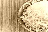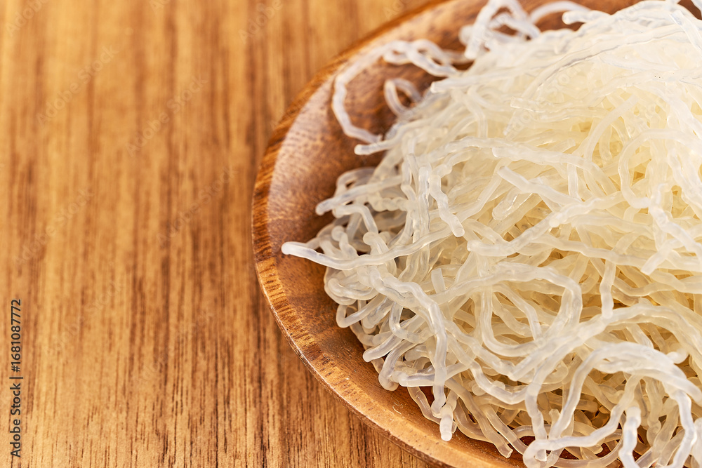 closeup Korean glass noodle vermicelli for Japchae food in wood bowl on wooden table food background with copy space