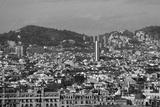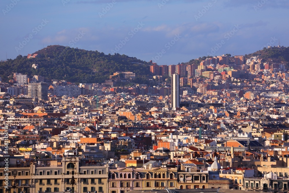 Eixample district of Barcelona city, Spain. Hills visible in background. Sunset light.