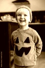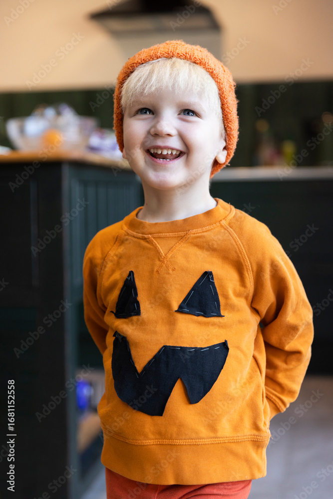 A little boy wearing a homemade pumpkin halloween costume