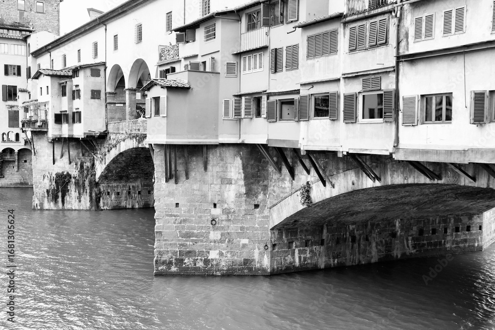 Ponte Vecchio - landmark of Florence, Italy. Black and white photo vintage style.