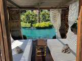 Loungers with white curtains and pool view