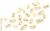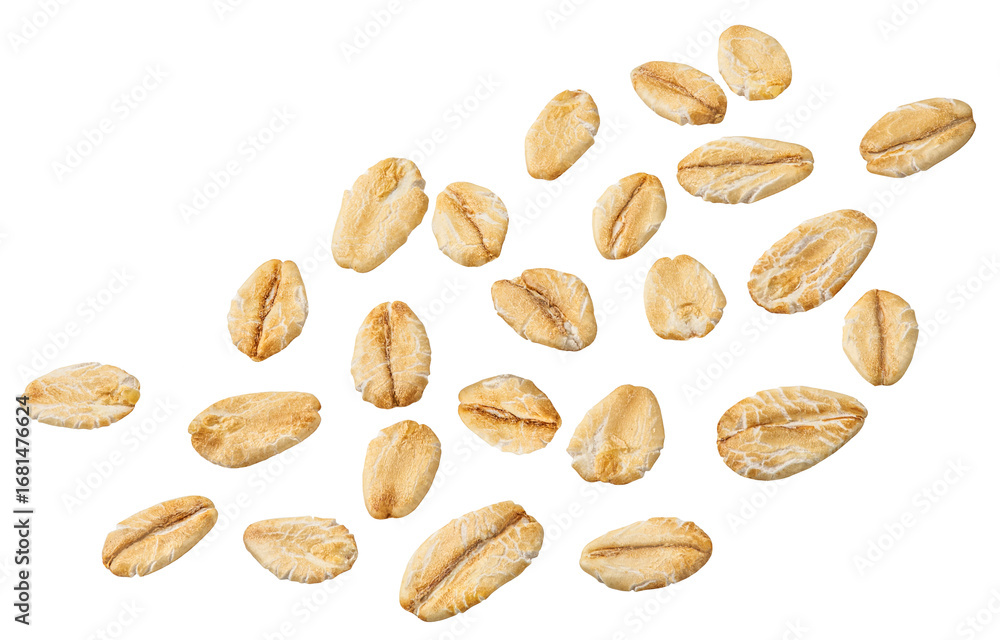 Levitating Oat flakes isolated on white background.Rolled oat flakes falling in the air. Flying oats Explotion. Pattern