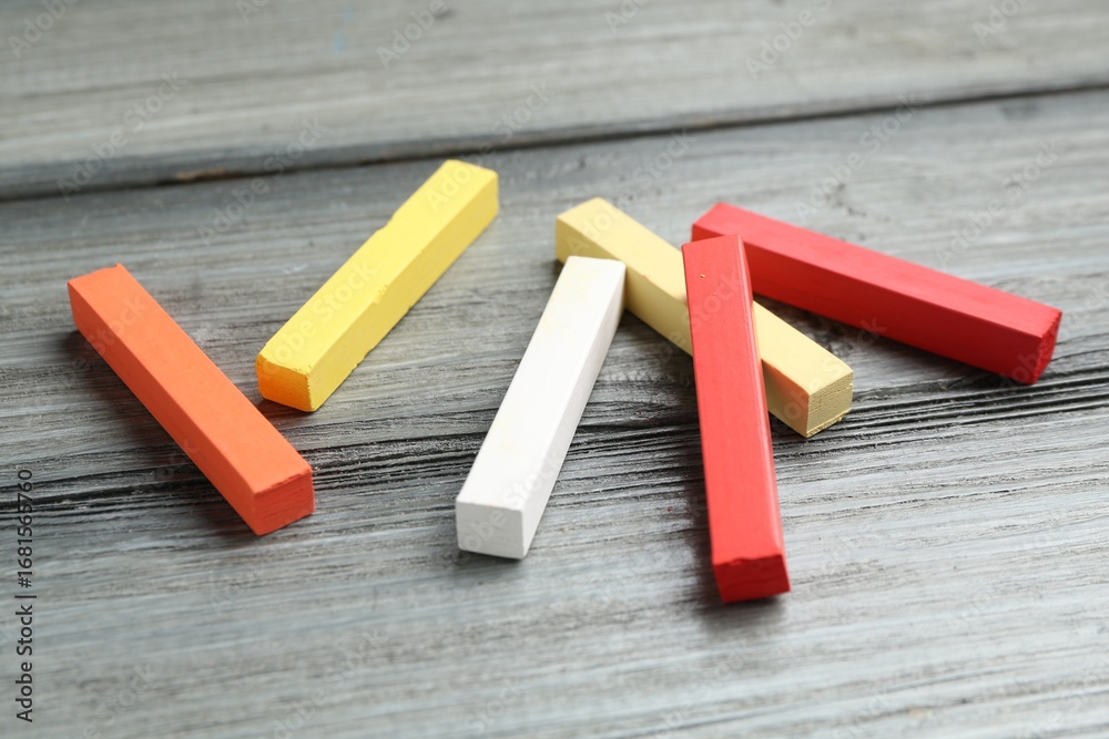 Colorful chalk pastels on wooden table, closeup