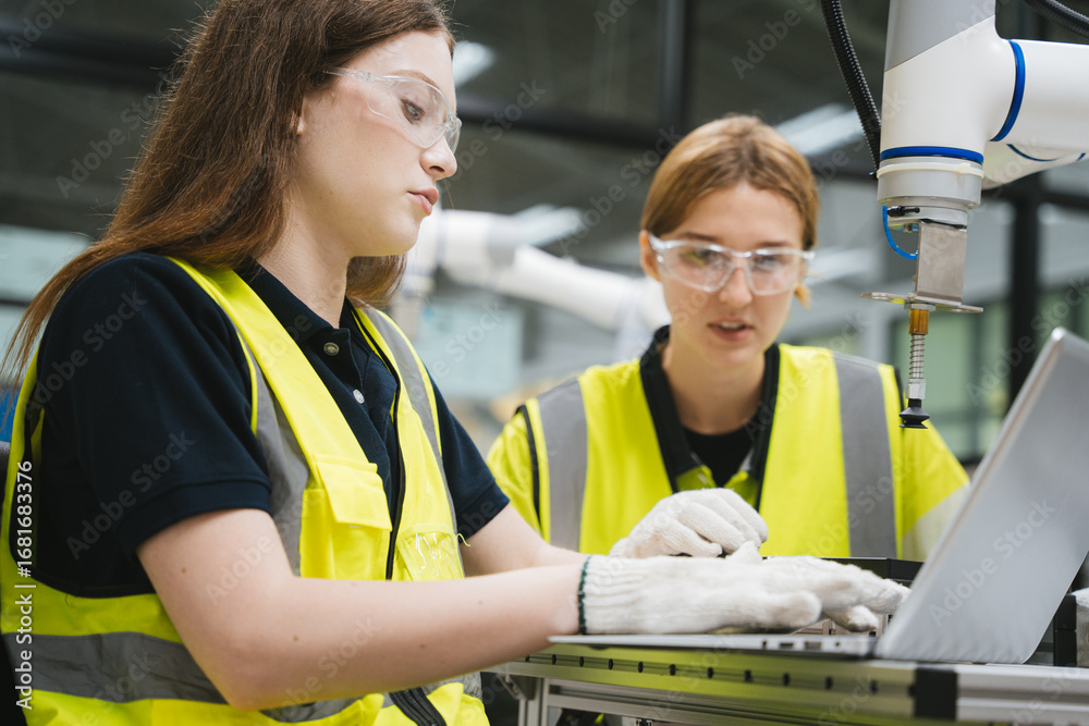 Female students learning AI and robotics in modern lab with laptop and industrial robot, concept of STEM education, teamwork, digital transformation, and future technology.