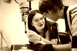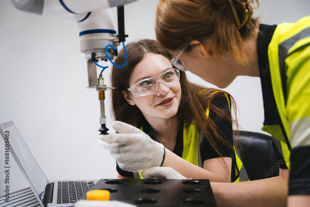 Female students collaborating in robotics lab with laptop and industrial robot, concept of AI learning, STEM education, teamwork, and future technology training.