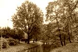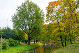 Beautiful autumn park with colorful trees reflected in water stream with ducks and footbridge. Tauride Garden, Saint Petersburg, Russia.