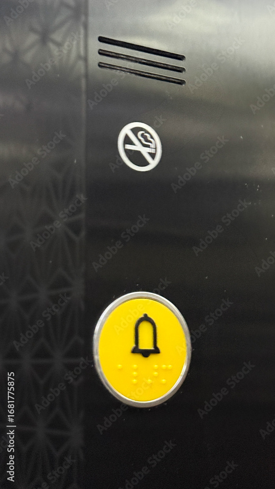 Yellow emergency elevator button, tactile braille design, urban navigation, accessibility awareness, No Smoking Day, unexpected urban intimacy