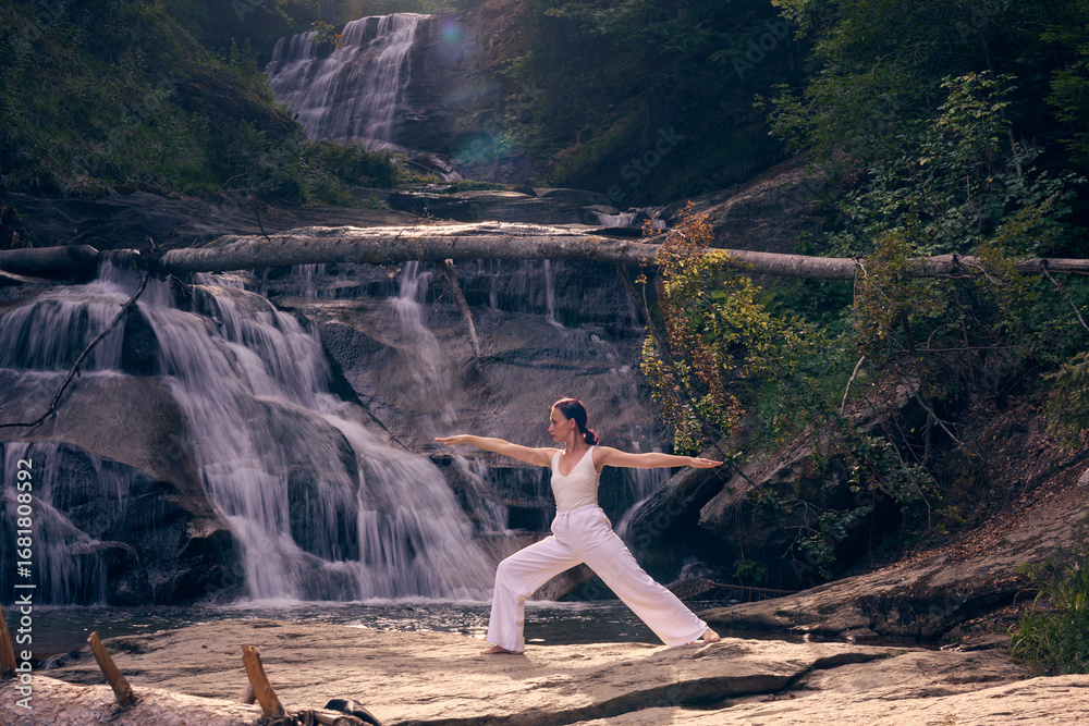 Woman practicing yoga warrior pose near waterfall at sunrise peaceful meditation in nature outdoor fitness