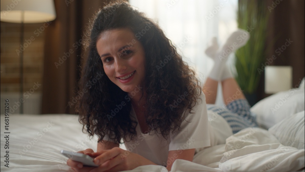 Smiling woman holding mobile phone in bed shopping girl smartphone morning bedroom Caucasian female teen relaxing comfort weekend home happy looking at camera scrolling cellphone online social media