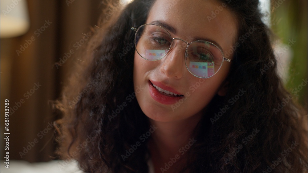 Smiling woman browsing computer screen reflection in eyeglasses Caucasian girl female in fashion glasses relax on bed studying with laptop online shopping comfortable weekend at home bedroom relaxing