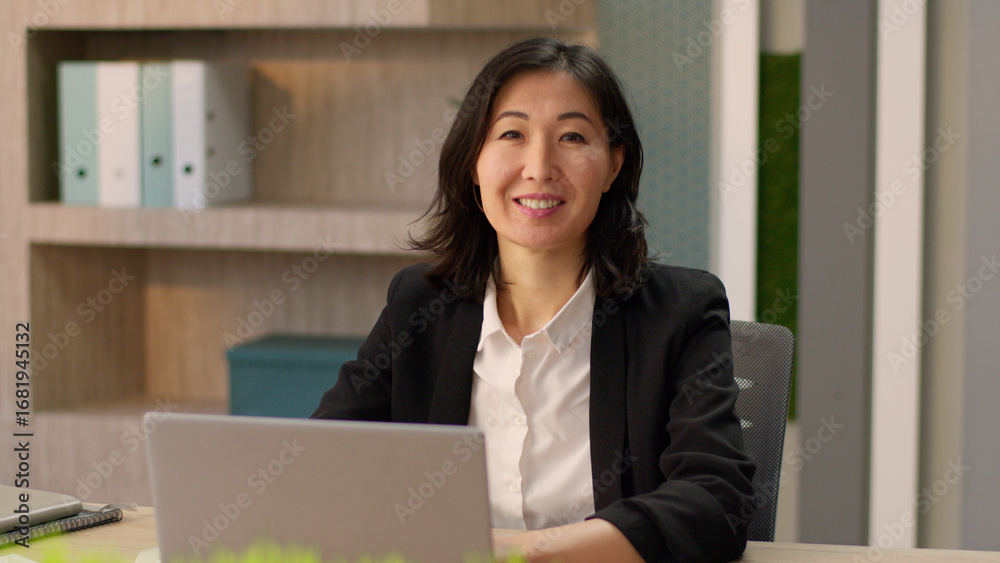 Chinese korean businesswoman Asian woman employer manager owner business company leader japanese girl entrepreneur online work study laptop e-commerce at office workplace smiling looking at camera