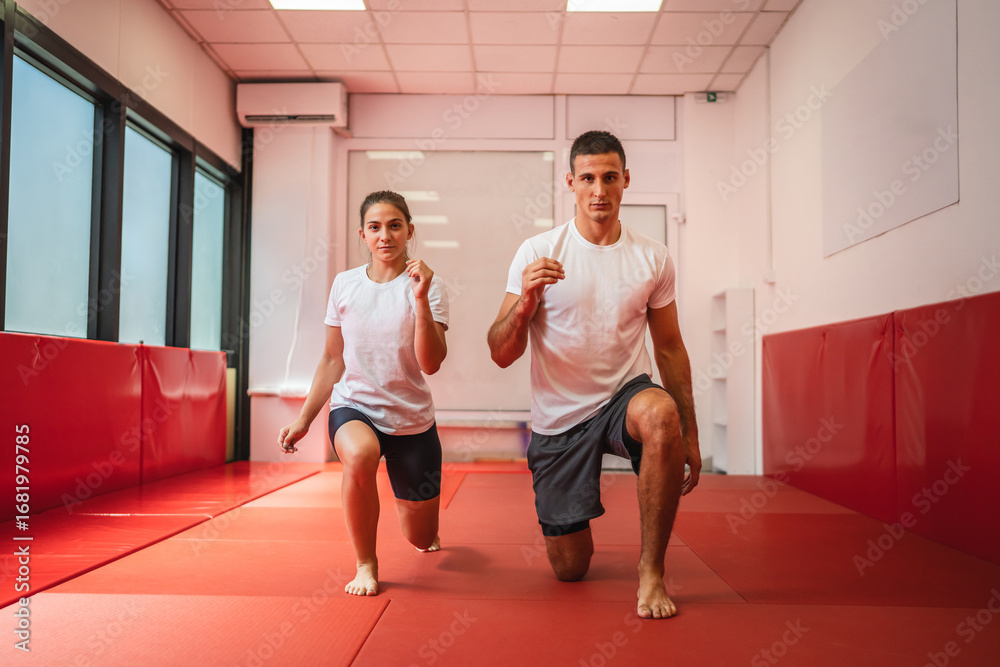 Athletes performing lunges in gym for leg workout