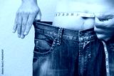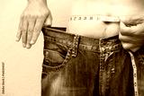 Concept of Man losing weight. Men wearing big jeans after diet.