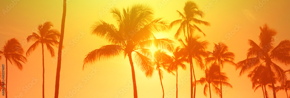 Golden Sunset Silhouetting Tropical Palm Trees in a Serene Nature Setting